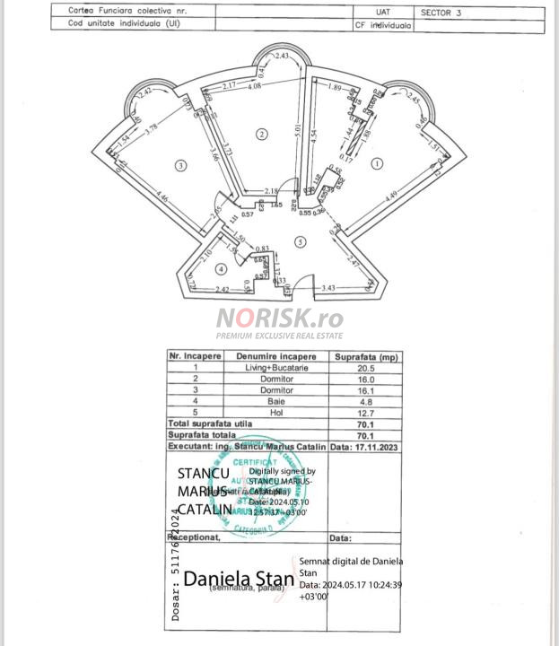 Apartamentul este amplasat la etajul 5 din 9, într-un bloc solid și bine întreținut, și are o suprafață utilă de 70 mp, cu compartimentare decomandată, ceea ce oferă intimitate, lumină naturală și un flux excelent al spațiilor.