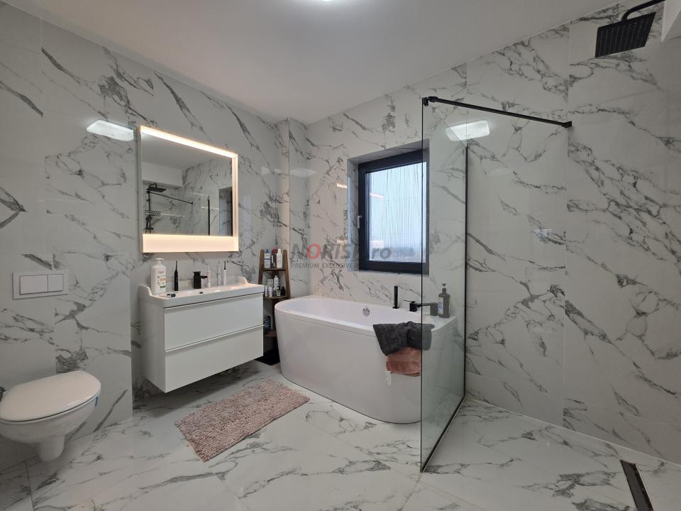 La parter, livingul de 35 mp devine centrul casei, separat elegant de bucătăria închisă, complet utilată, ideală pentru cei care apreciază ordinea și intimitatea. Etajul este dedicat zonei de noapte, cu trei dormitoare spațioase, dressing și băi corect dimensionate.